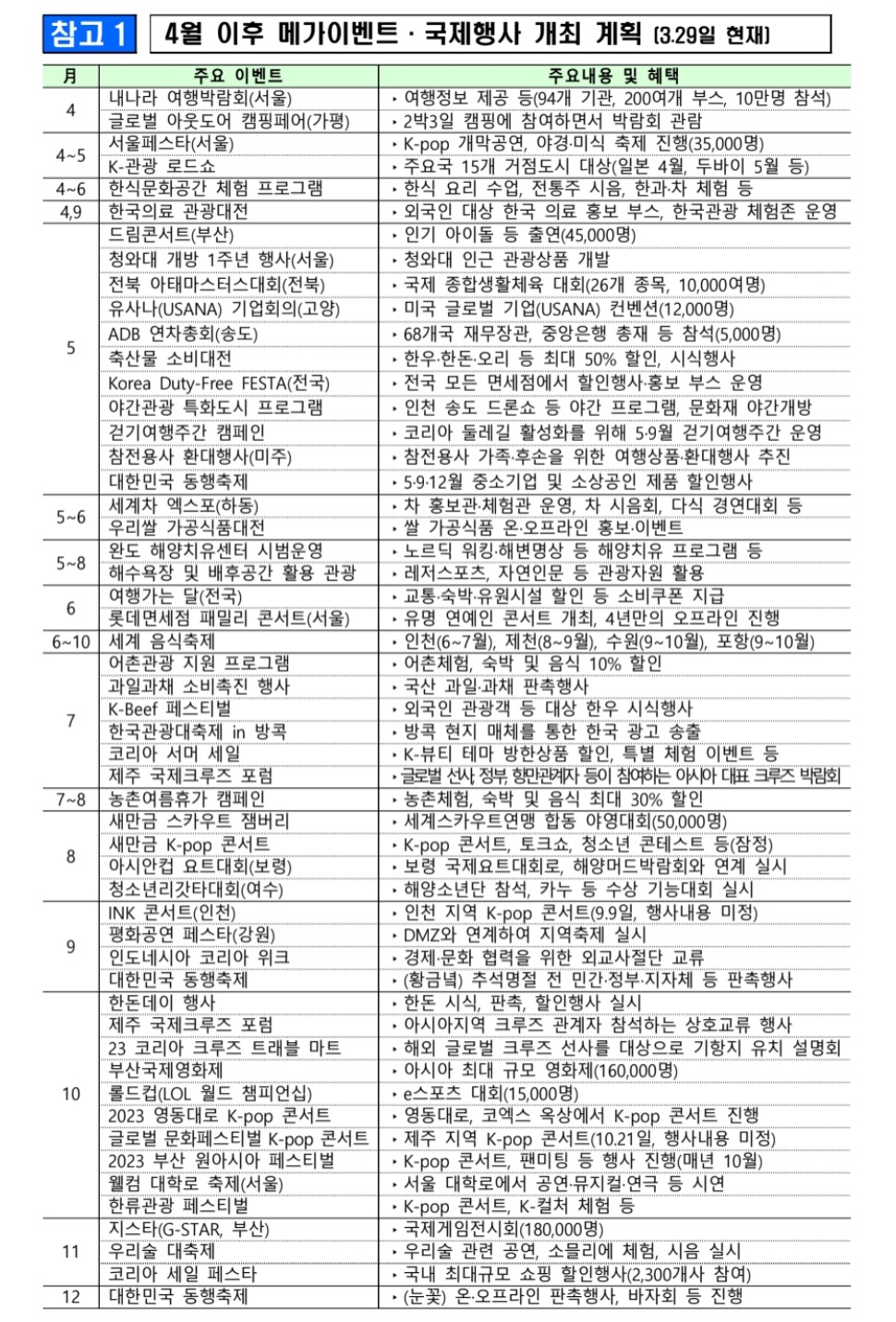 정부에서 내수시장 활성화 방안을 발표하며 안내한 2023년 4월 이후 시행 예정인 굵직한 행사들을 소개합니다.